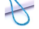 Neon Apatite Heishi Faceted Silver Necklace — Apatite was named in 1786 by the German geologist Abraham Gottlob Werner. Apatite gemstones can be green, blue, purple, violet, pink, yellow, colorless, and brown. From neon blue to apatite or blue-green, Madagascar is one of the rarest and most popular colors. Green apatite is also known as stone asparagus, and the green apatite first discovered in Arendal, Norway is called morocite. Apatite is a special treasure when cut properly, but too soft for most jewelry. Apatite defines 5 reference minerals on the Mohs scale of hardness.